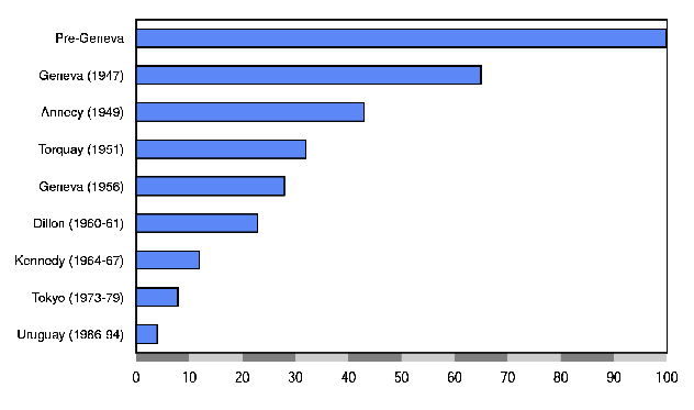 Kurz nach dem Ende des Zweiten Weltkriegs wurden im Rahmen des Bretton-Woods-Abkommens neben dem Internationalen Währungsfonds regelmäßige Verhandlungsrunden installiert, die unter dem Namen GATT (General Agreement on Trade and Tariffs) bekannt wurden. Das Ziel war eine schrittweise Handelsliberalisierung durch Senkung der Importzölle und die ,,Einhaltung wichtiger Prinzipien für den Warenaustausch`` (NUHN, 1997, S. 136). Das Beispiel der USA als Industrieland -- die Einfuhrzölle von Entwicklungsländern sind in der Regel höher (SIEBERT, KLODT, 1999, S. 121) -- zeigt, daß das Einfuhrzollniveau in den acht GATT-Verhandlungsrunden bis zum Abschluß der Uruguayrunde drastisch gesenkt wurde (vg. Abb. 5). 1994 wurde in der Uruguay-Runde beschlossen, eine neue Handelsorganisation, die World Trade Organization WTO zu schaffen, die als Institution bei Handelsstreitigkeiten schlichten soll und die Macht hat, für die Mitgliedsländer verbindliche Regelungen auszusprechen und damit einen der größten Kritikpunkte an GATT ausräumt (SMEETS, 2000, S. 21).